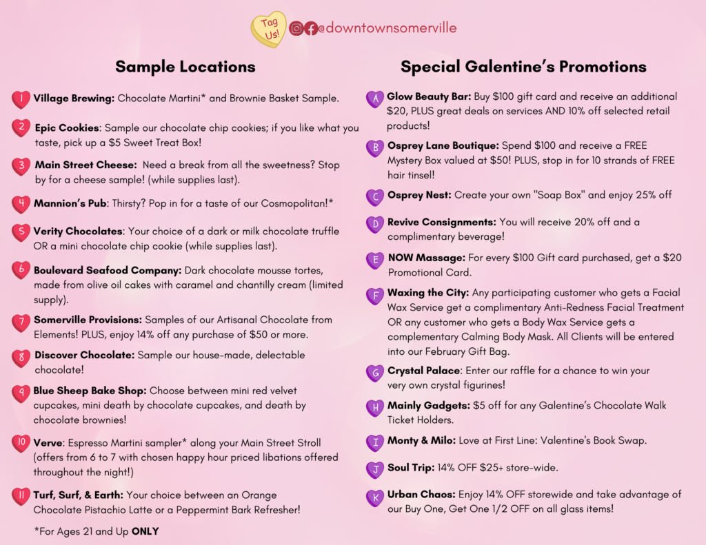 Our Galentine’s Chocolate Walk has officially sold out, but there’s still plenty to enjoy in Downtown Somerville! While ticket holders will receive exclusive chocolate samples from local businesses, everyone is welcome to explore the amazing in-store events and promotions happening all over town.